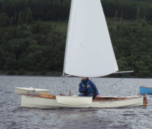 The original Solway Dory Petrel, professionally made by them in 2002. It is owned and has been sailed by Jan Poskitt since then. Made from marine grade plywood with a 44sq ft bermudan sail. Originally painted green, it has been repainted white, with the addition of a pair of outriggers. It was the predecessor to the fibreglass Shearwater. It comes with built in side buoyancy tanks, a small bowtank under the foredeck, and a large rear tank with a hatch for the stowing of camping gear.It has adjustable seats for one or two people and comes with its own portage trolley.