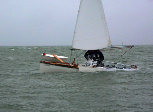 Having found Astrid capable of handling the conditions I relaxed into a rhythm of hiking out hard and spilling wind in the gusts whilst I picked a path upwind avoiding the largest waves. Sailing a bit freer (less close to the wind) than usual helped to keep Astrid moving well and avoided us being stopped by the larger waves. As we crossed the Western Solent Ian and I kept pace with each other but without a self bailer, Ian was forced to stop three times to bail out his cockpit. However, these breaks were also an opportunity for me to sail to and fro on a reach at high speed and for Ian to try to snatch a few photos, whilst being bounced around the waves and buffeted by the wind and rain. As we approached Yarmouth and the lee of the Isle of Wight, the gusts increased in strength but the wave height diminished. We sailed into Yarmouth harbour just after 1.00 and at the slipway beside the Lifeboat station, we pulled our boats out of the water on the small Solway Dory launching trolleys we’d carried in our canoes’ forward buoyancy compartments and parked at the top of the slipway.