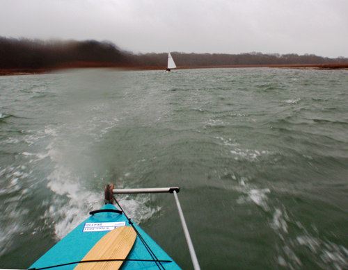 To warm up and to recover we huddled in the nearby bus shelter and ate our sandwiches whilst contemplating the harbour and watching the seagulls flying on the spot in the breeze. Our next leg was to take us 1 1/2 nautical miles up to the head of navigation of the River Yar. Apparently, talking in geological time scales, the River Yar was once a much longer river but then lost its headwaters due to erosion of the south coast of the Isle of Wight. Consequently, it is now a short diminutive river, more of a stream I’d say, but with a surprisingly fair sized tidal estuary which ends only a mile from Freshwater Bay on the South side of the island. After lunch we lowered our masts, launched and warmed up whilst paddling through the harbour and under the road bridge at the far end. We set sail again on the South side of the bridge and tacked upstream with the young flood. The estuary, running through a reeded salt marsh, became progressively narrower and our tacks shorter and shorter. Ian proved much more adept than me at tacking in tight spots whereas I managed to hit the soft sticky mud at least three times so decided to furl the sail and paddle the last 1/2 mile, reaching the end of the tidal estuary just after Ian. He maintained this was cheating but as a Wayfarer sailor I guess he’s not so used to making useful speed under manual power.
