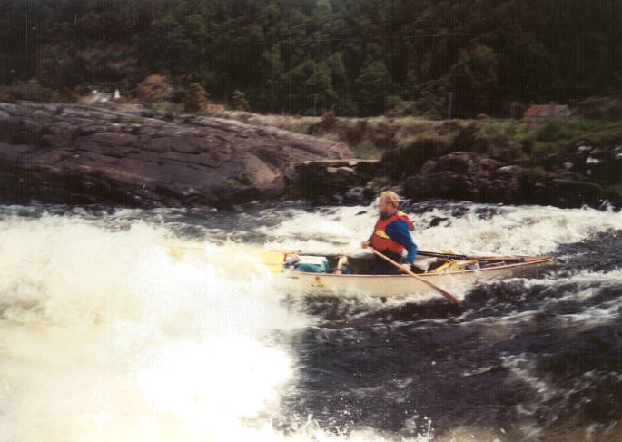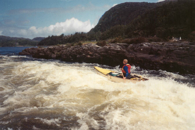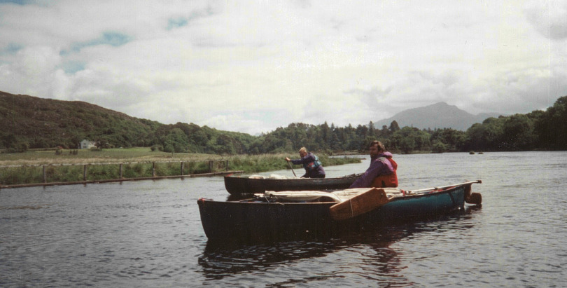 Eventually I found them camping in one of the fields belonging to the B&B and quickly enthused them about the weather forecast. They had moved the boats for security and because the rain had caused the loch to rise a foot or two. The wind was still quite fresh just then so we agreed to run the river and only continue on the fairly exposed coastal section if we liked the look of the conditions down at the entrance to Loch Moidart, with another option being to go east up the sea-loch if the open sea looked dubious. Packing up and preparing ourselves and the boats took a fair while but this gave the wind a bit more time to moderate. At about 11.30 we were all ready and pushed off again glad to be on the move once more. The couple who had provided B&B were kind enough to let me park the car and trailer in their grounds and also came to see us to go down the first part of the river, which was very scenic passing through a narrow stone bridge. They warned us that the river was tricky later on but with both Andy and Tony having independently checked it out previously and not having found anything to concern us we concluded that they may not fully understand canoes and their capabilities. The river was flowing high and fast due to the heavy rain of the previous day but the sun was out, the scenery wonderful and the only slightly irritating factor was the breeze which pushed us around from time to time. When we had paddled most of the length of the river, amounting to about 3 miles or so, and almost having reached tidal waters once more, it came as an added challenge and surprise to find a short but serious-looking fall. On bank inspection I reckoned a narrow but feasible line would be worth risking even in a laden canoe with its sailing gear stowed but still mostly in place. Andy was sceptical but happy for me to be the “rapid probe/test pilot” whilst Tony was probably the wisest of us all, choosing to ease down a small side-stream. Having studied the rapid and the consequences of getting the line wrong, I carefully prepared my canoe and myself both mentally and physically before going for it! It actually turned out to be boisterous but less challenging than it appeared. Once Andy had also run it and Tony negotiated his chosen prudent route we regathered at the far side of the tidal pool to have lunch, elated at the extra somewhat unexpected adventure.