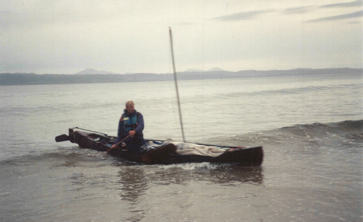 There was still a breeze blowing hard enough to be a pain whilst paddling out the 3 miles to the mouth of Loch Moidart, during which we passed many seals. At one point I even spotted an otter only a few yards away, which after a bit of chittering at me continued feeding, unconcerned at our intrusion into its spectacular environment. Once at the skerries near the sea-loch entrance the wind seemed to have eased as promised in the forecast, so we set our sails again to close-reach north towards the Arisaig promontory in the light westerly breeze, our canoes rising and falling on the several feet of swell with us enjoying the views of the Small Isles and Skye in the distance. This was one of those occasions when for no explicable reason we seemed involuntarily to take it in turns to sail faster or closer to the wind, each of us at some time going better than the others for a while. Initially when we had set out we could not fetch the end of the headland but somehow after a couple of hours and without having tacked (probably because of the wind backing slightly) we were skirting with the rocks and skerries off Arisaig. We took the short cut inside several of these and the swell provided some sporting rock-dodging, especially as the larger waves passed by. I think one of these gave Tony a fright, as a dark and forbidding rock suddenly reared up very close-by. The wind continued to lessen as we sailed into the evening, dropping to nothing as dusk approached. So, although we were all fairly tired from the stiff paddle earlier in the day, a spell of paddling was nevertheless needed to reach a landing near Morar, a few miles short of Mallaig. A silver-sand beach, a hot meal and a great sunset rounded off a day to remember with just over 20 miles covered.
