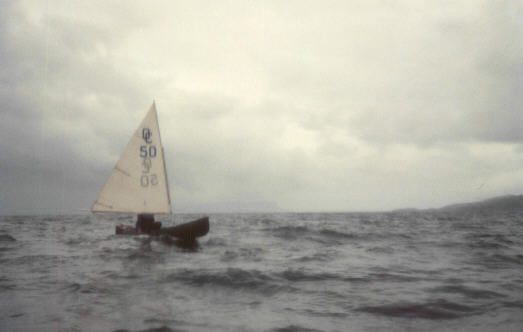 Any idea that a trip was all sweetness and light winds would be deceptive of course, and only a few hours after that sunset our fortunes changed once more. The idea had been that we would get some rest while it was dark and probably continue shortly after dawn, if the conditions were okay. During our overnight bivouac the forecast light drizzle and mist developed into steady rain for which we had foolishly not prepared resulting in two of us getting a bit wet; we needed shelter and to dry out, so at dawn (4.30am!) we packed up and headed the few miles north to Mallaig in what initially seemed to be only a light breeze, but which quickly grew into a Force 3-4, gusting 5. This meant we were again on the edge of what we had learned was feasible or sensible with our boats. Although only a few yards from the rocky shoreline the sense of exposure was great, surfing fast down the waves and fighting at times to avoid broaching or burying in the waves, which we were able to overtake even using our smallest sail area; (our average speed for that short hop was around 5 mph).
