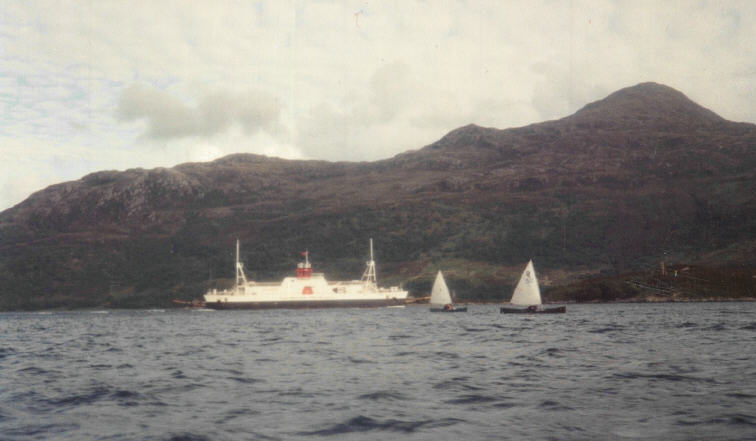 In spite of a very comfortable bed I was awake early on the following morning and crept out at 6am to look at the weather and sea-state. It was a bumpy F4, still just a bit too much for us and I went back to bed. By 8.30 the wind was down to only F2-3 from the south and the waves were also dying off. I got quite excited about this chance to do the 5 miles across to Skye and dashed back to drag the others from their sleeping-bags and implore them to hurry up and pack. This process inevitably takes quite a while and it wasn’t until 10.35 that we pushed off in the harbour and headed out across the Sound of Sleat on a pleasant broadish reach towards Armadale.