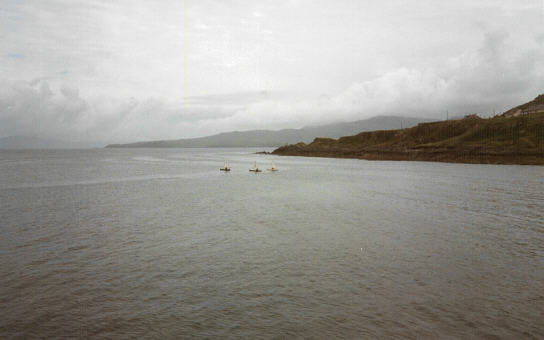 During the meal break the shipping forecast suggested deterioration for the next day so although the tide would be against us at Kyle of Lochalsh it would only be relatively weak at about 2 knots, so we thought we should press on into the evening in the good conditions. It was west into the prevailing wind again but we still managed to make steady progress on the relatively sheltered and therefore smoothish water. As we neared the next narrows at Lochalsh/Kyleakin the current running against us became very noticeable and after a brief pause to discuss tactics we proceeded to beat past the ferries towards the very narrowest gaps where the new bridge was being built. We even managed to do some synchronised tacking just in front of the large hotel but whether anyone was impressed we shall never know! Following a couple of abortive attempts to get through the gap against both the tide and wind, we concluded that the only way to proceed would be to paddle like crazy for the few hundred yards necessary to get through and clear of the worst tide before rehoisting sails to continue.